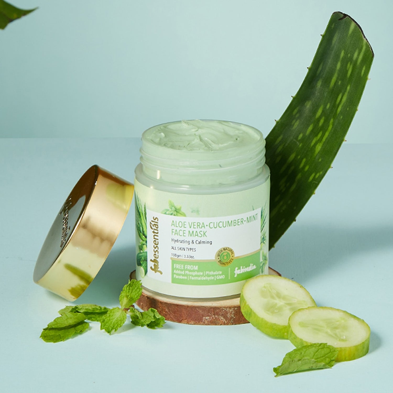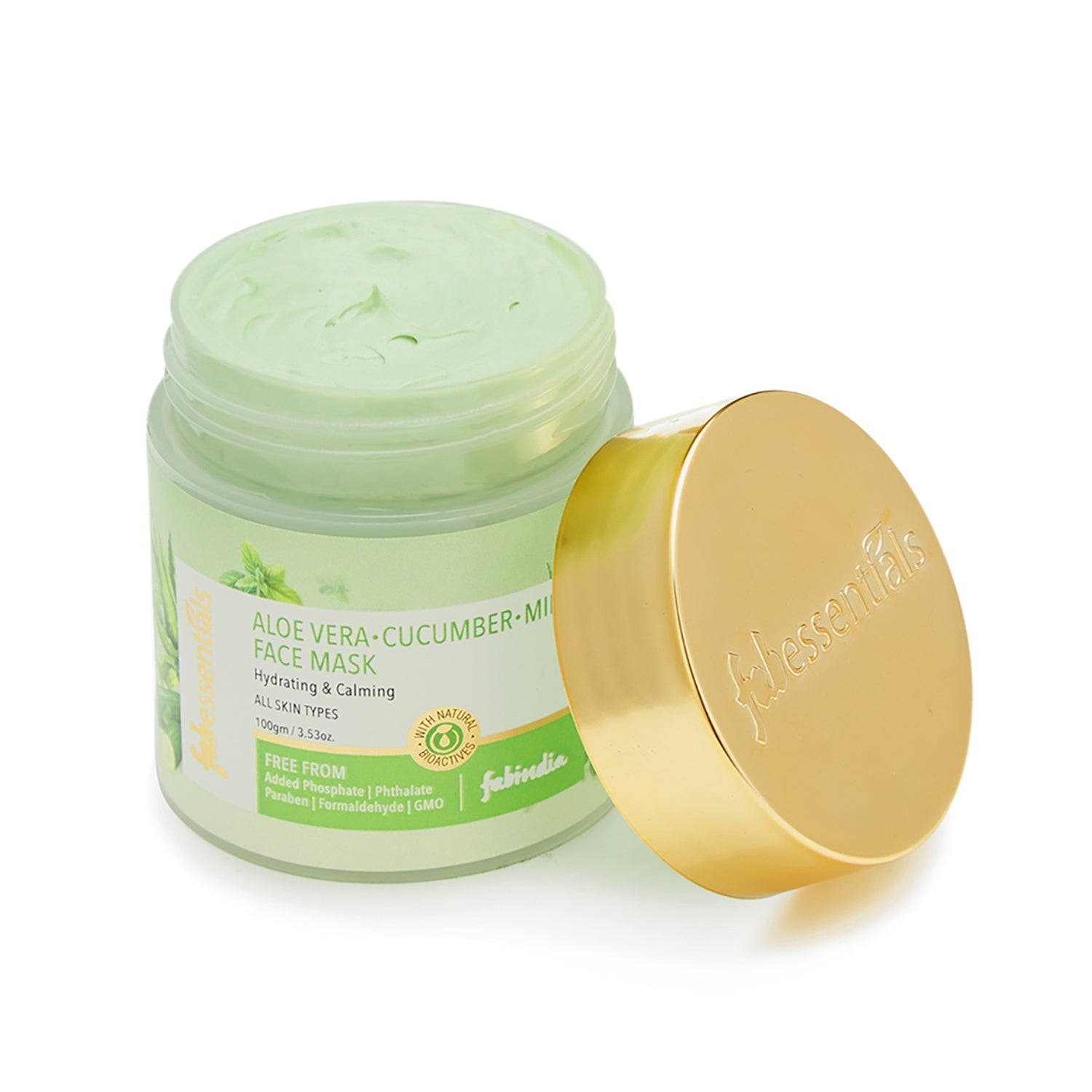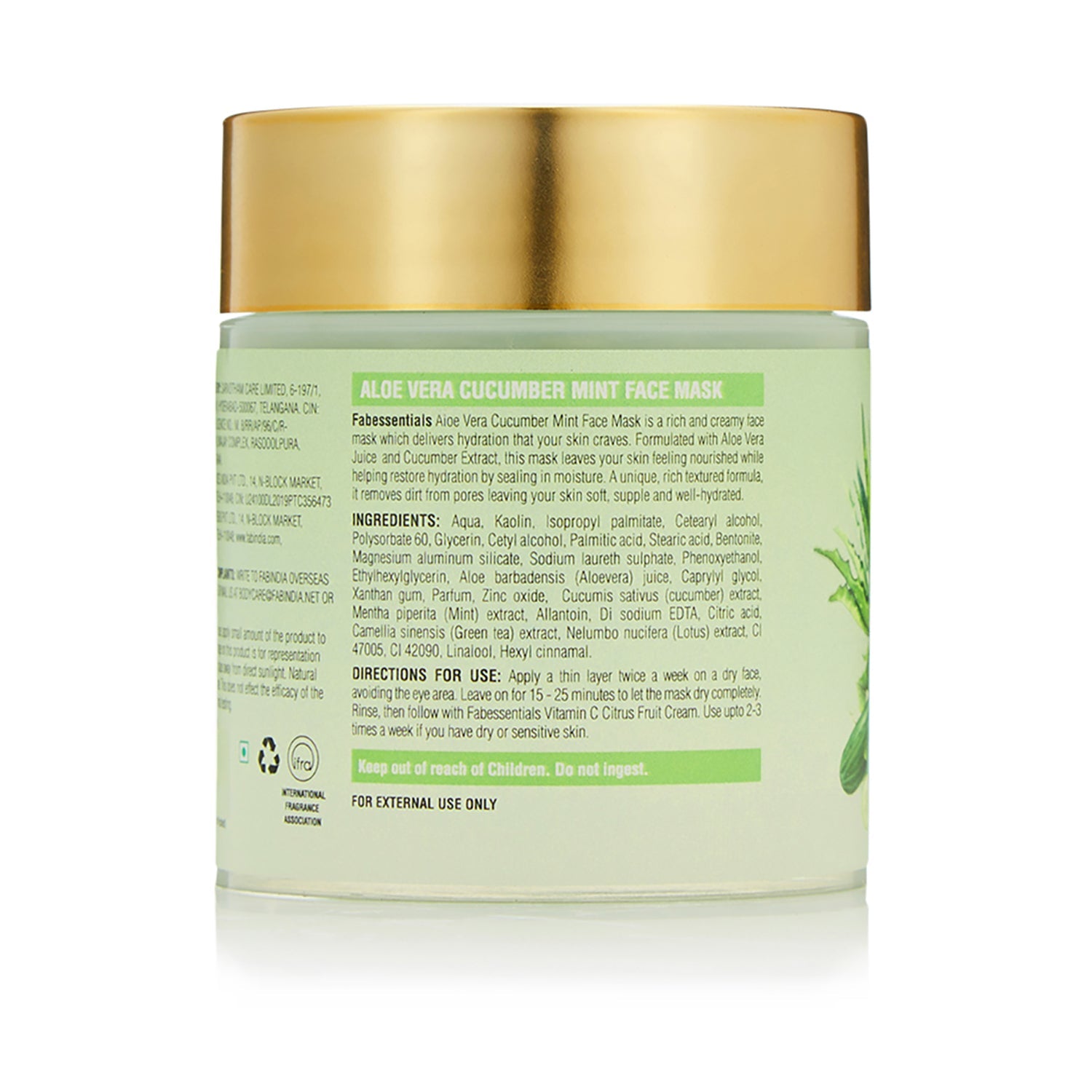 Description- Fabessentials Aloe Vera Cucumber Mint Face Mask is a rich and creamy face mask which delivers hydration that the skin craves. Formulated with Aloe Vera Juice and Cucumber Extract, this mask leaves the skin feeling nourished while helping restore hydration by sealing in moisture. A unique, rich textured formula, it removes dirt from pores leaving the skin soft, supple and well-hydrated.