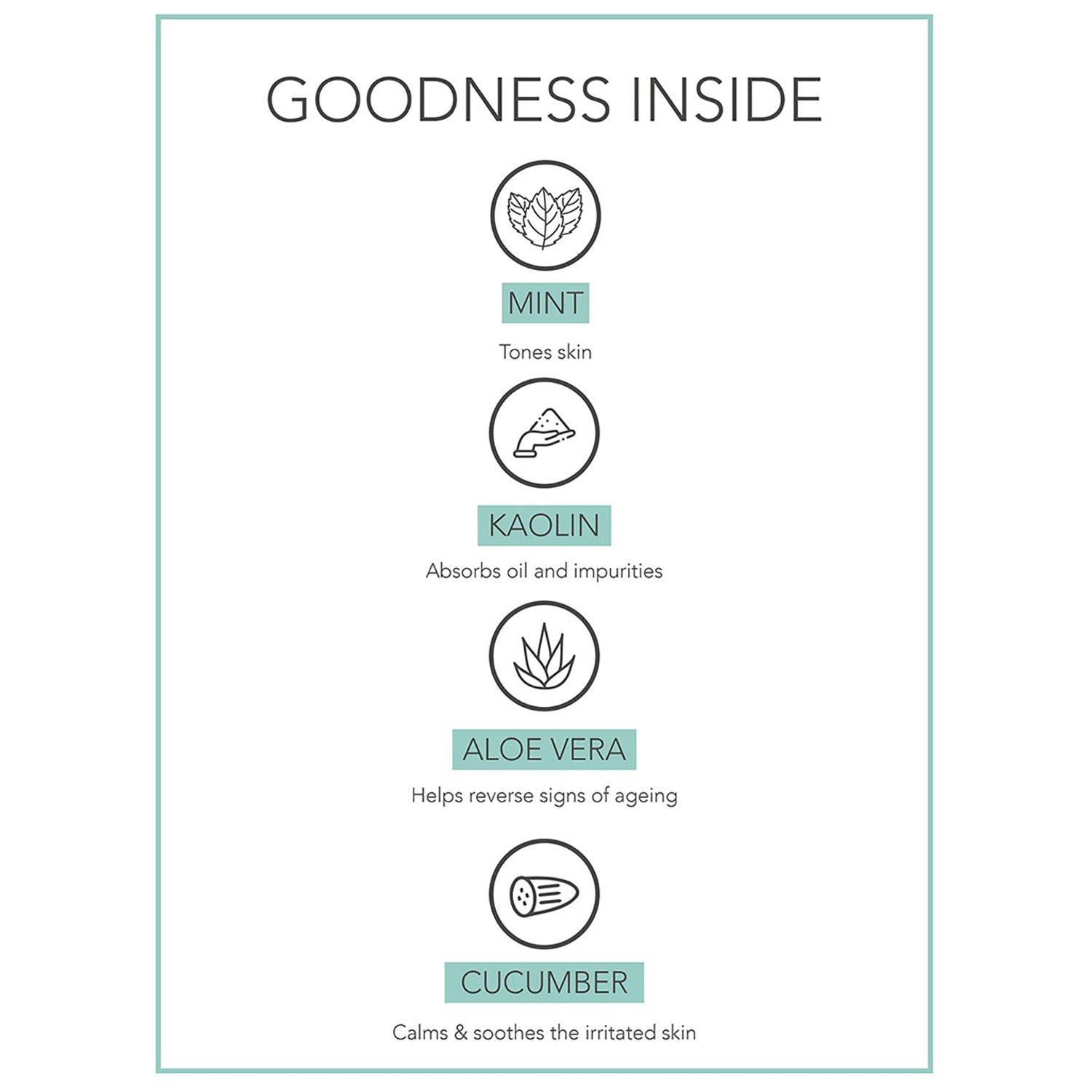 Kaolin, Aloe barbadensis (Aloevera) juice, Caprylyl glycol, Cucumis sativus (cucumber) extract, Mentha piperita (Mint) extract, Allantoin, Camellia sinensis (Green tea) extract, Nelumbo nucifera (Lotus) extract