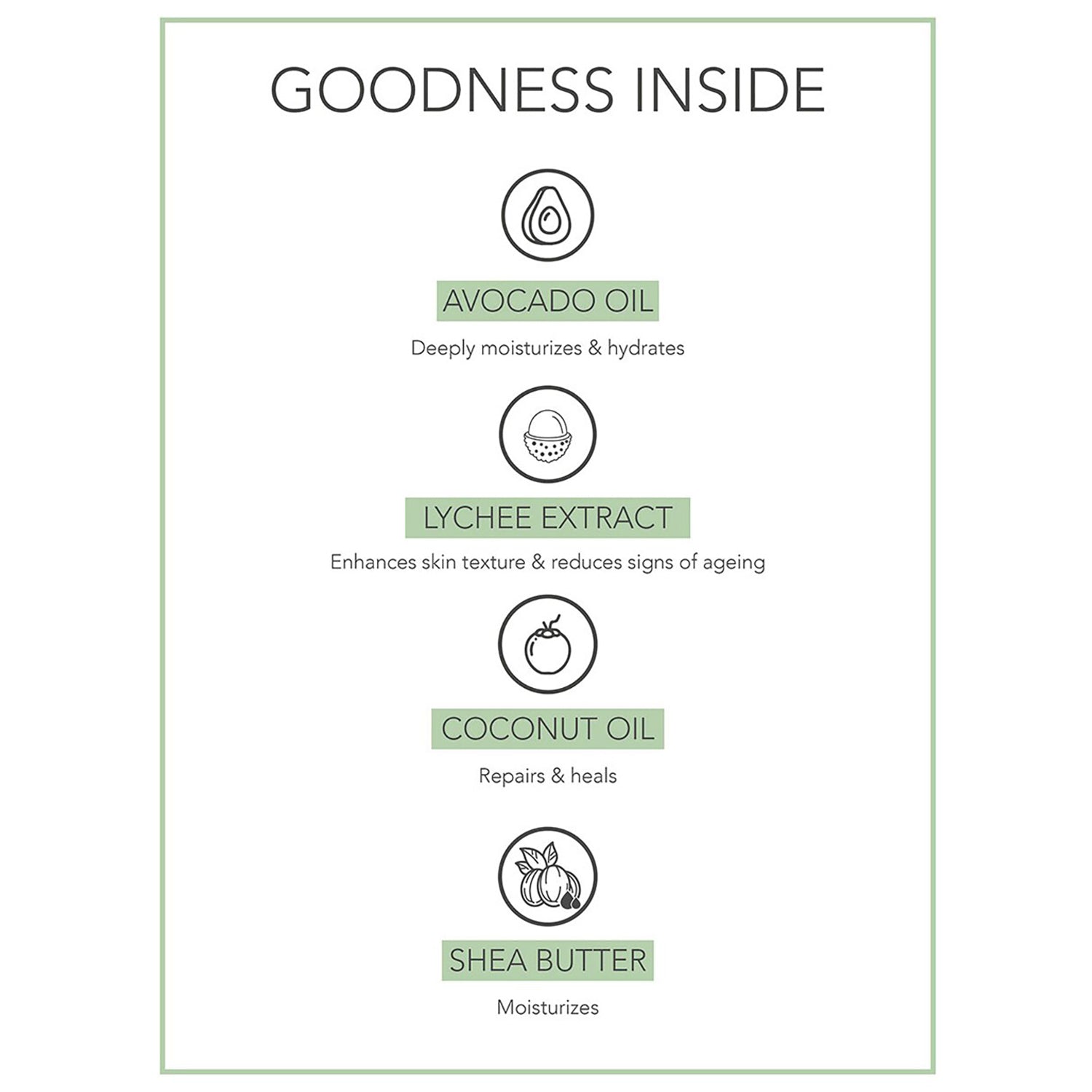 Glycerin, Theobroma Cacao (Cocoa) Seed Butter, Butyrospermum Parkii (Shea) Butter, Allantoin, Cocos Nucifera (Coconut) Fruit Oil, Litchi Chinensis (Lychee) Fruit Extract, Niacinamide, Persea Americana (Avocado) Oil, Tocopheryl Acetate (Vitamin E)