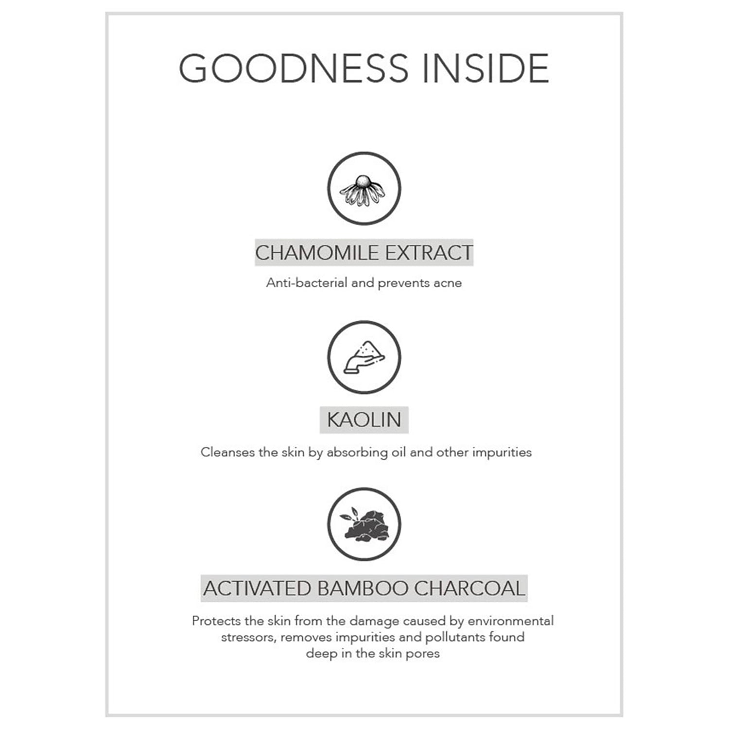 Kaolin, Bamboo charcoal powder, Matricaria chamomilla (Chamomile) Mentha arvensis (Menthol), Allantoin
