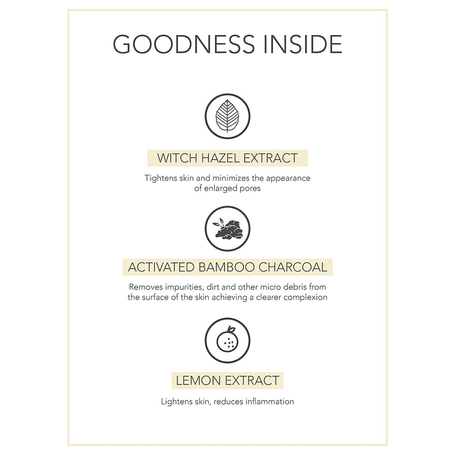 Glycerin, Juglans regia shell (Walnut) powder, Bamboo charcoal powder, Parfum, Hamamelis virginiana (Witch hazel) extract, Citrus limon (Lemon) extract