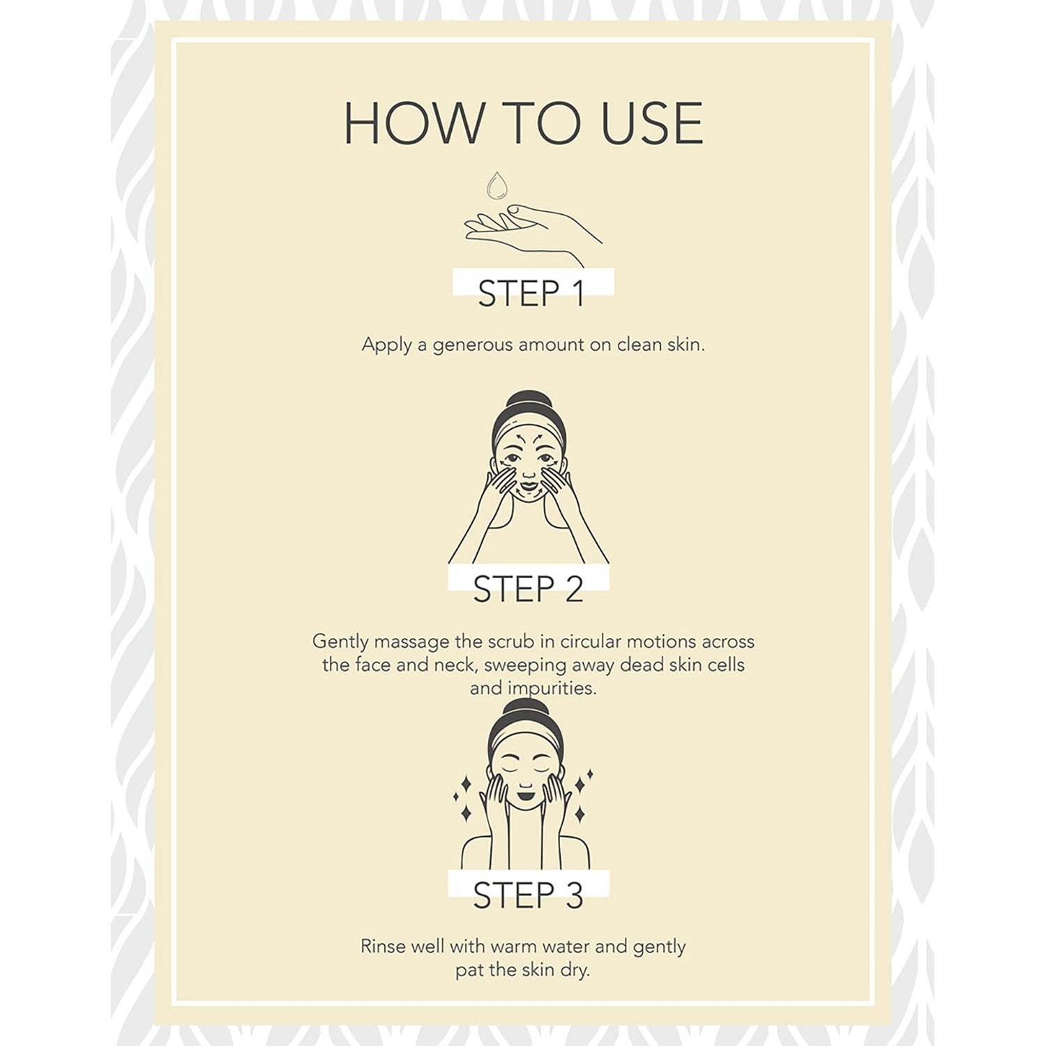 Place a dollop (about 3 gm) on your hand and spread it gently around the entire face in a circular motion. Avoiding the eye and mouth areas, and lightly massage as you do so. Rinse with cold or Luke-warm water. For all skin types, we recommend using 1-2 times a week. Follow with 100% Organic Neem Tulsi Moringa Facial Water.