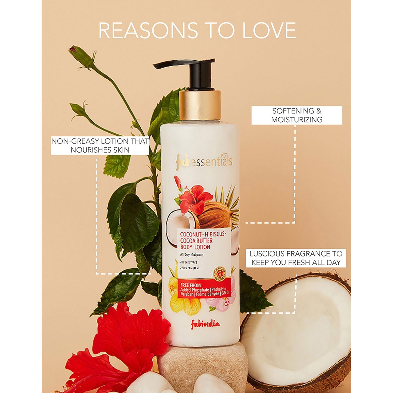 Fabessentials Coconut Hibiscus Cocoa Butter Body Lotion is a quick-drying, non-greasy lotion that nourishes dry skin with cocoa butter, while antioxidant-rich & raw coconut oil helps to soften and protect. The result is smooth skin, delicately scented with a luscious fragrance to keep you fresh all day. Carefully formulated to moisturize and nourish the skin without feeling greasy or oily & leaving behind a soft, supple & smooth skin.