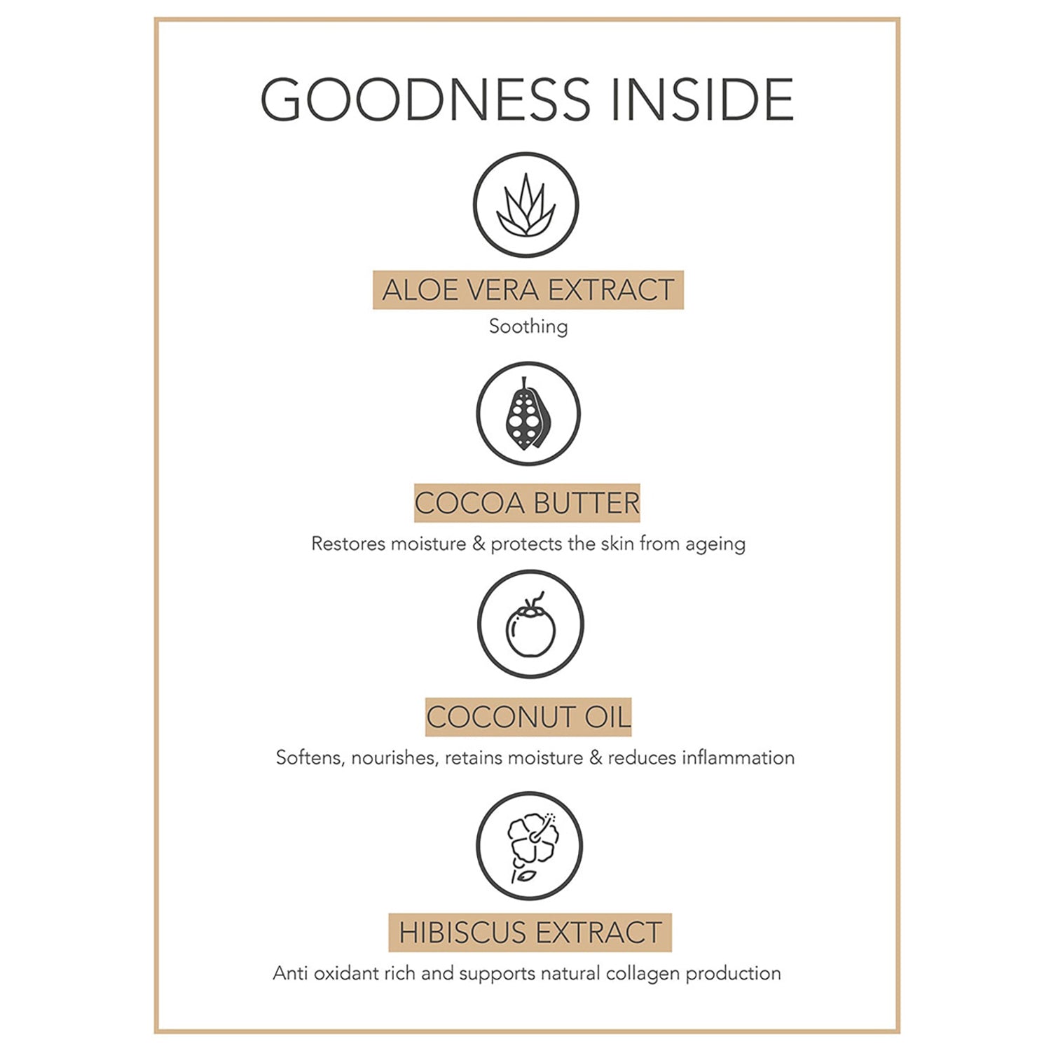 Aloe Barbadensis (Aloe Vera) Extract, Butyrospermum Parkii (Shea) Butter, Cocos Nucifera (Coconut) Fruit Oil, Hibiscus Rosa-Sinensis (Hibiscus) Extract, Theobroma Cacao (Cocoa) Seed Butter, Tocopheryl Acetate (Vitamin E), Triticum Vulgare (Wheat) Germ Oil