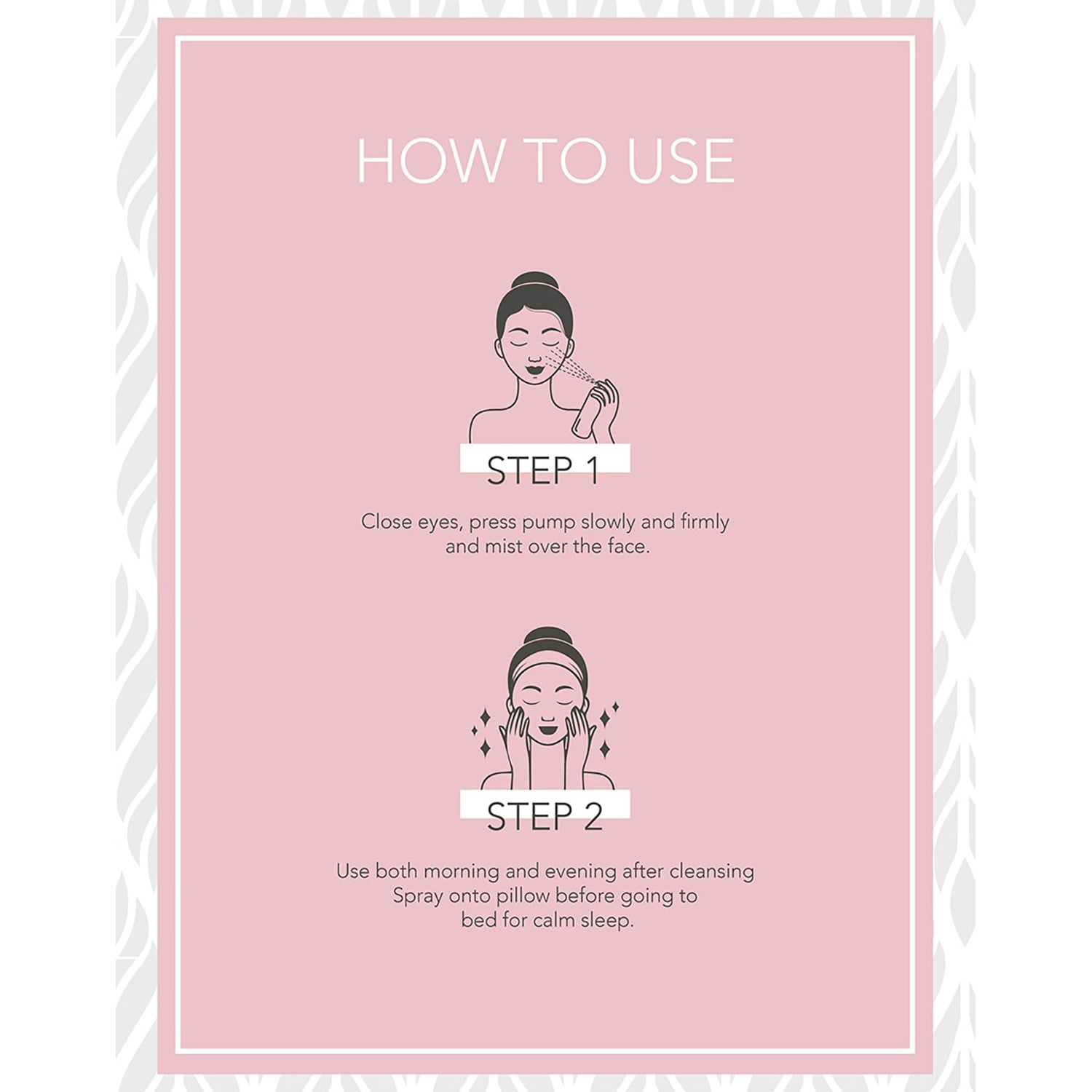 Close eyes, press pump firmly and mist over the face. Use both morning and evening after cleansing and throughout the day to refresh your make-up. Spray onto your pillow before going to bed for a calming and pleasant fragrance while you sleep.