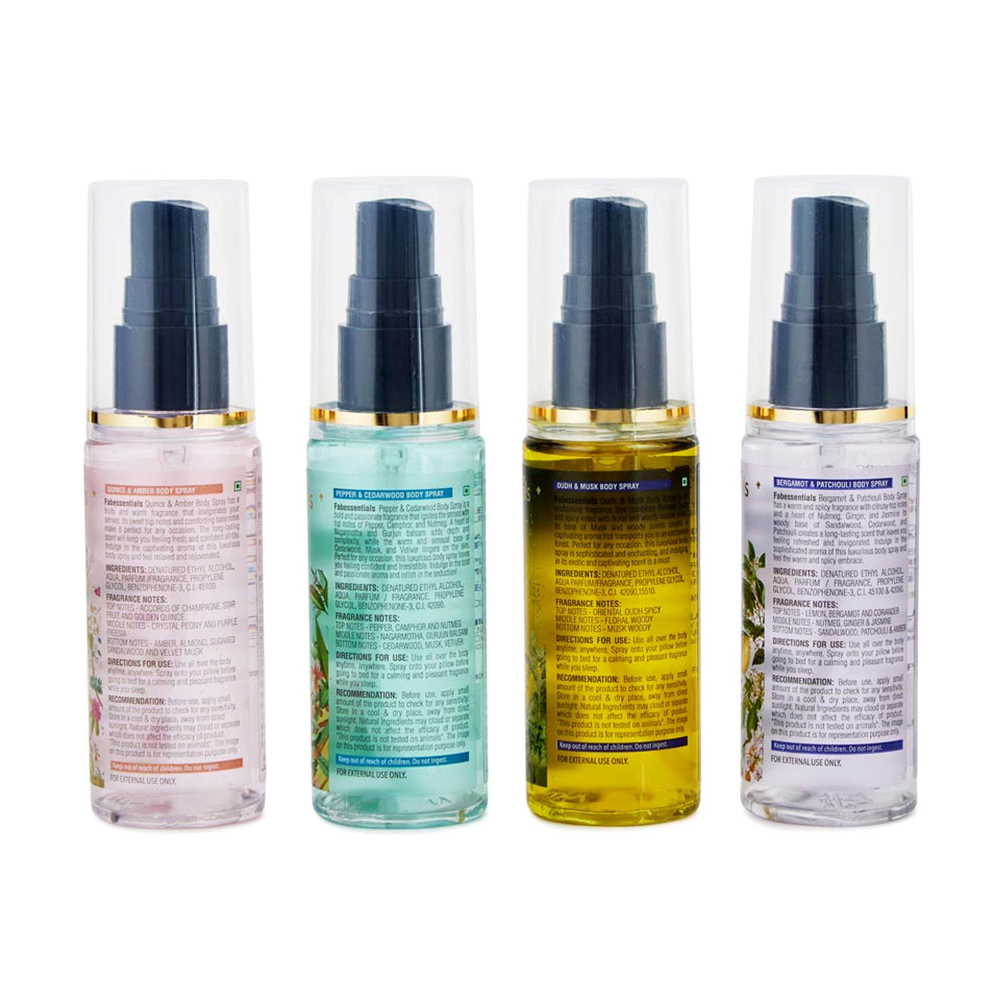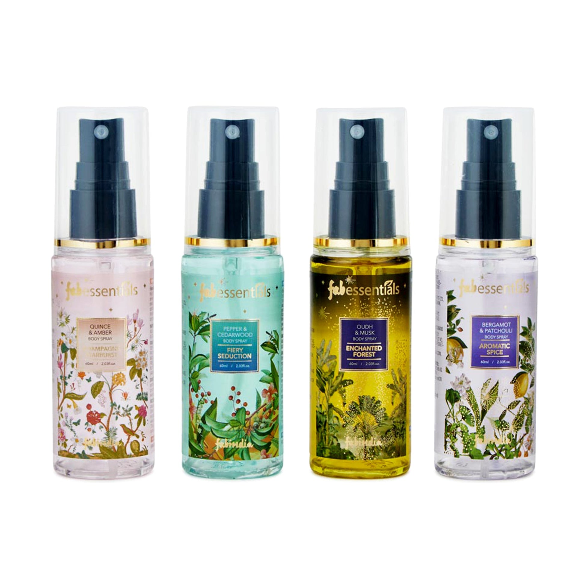 | Delight in this assortment of 4 premium unisex body sprays, each with a unique and refreshing fragrance. The scents are designed to invigorate and leave you feeling confident throughout the day. The set offers fruity, floral, warm, woody, and exotic aromas, catering to a range of preferences. These body sprays feature long-lasting formulas and fragrances as per IFRA guidelines, making them perfect for those who want to smell great and feel their best every day. |