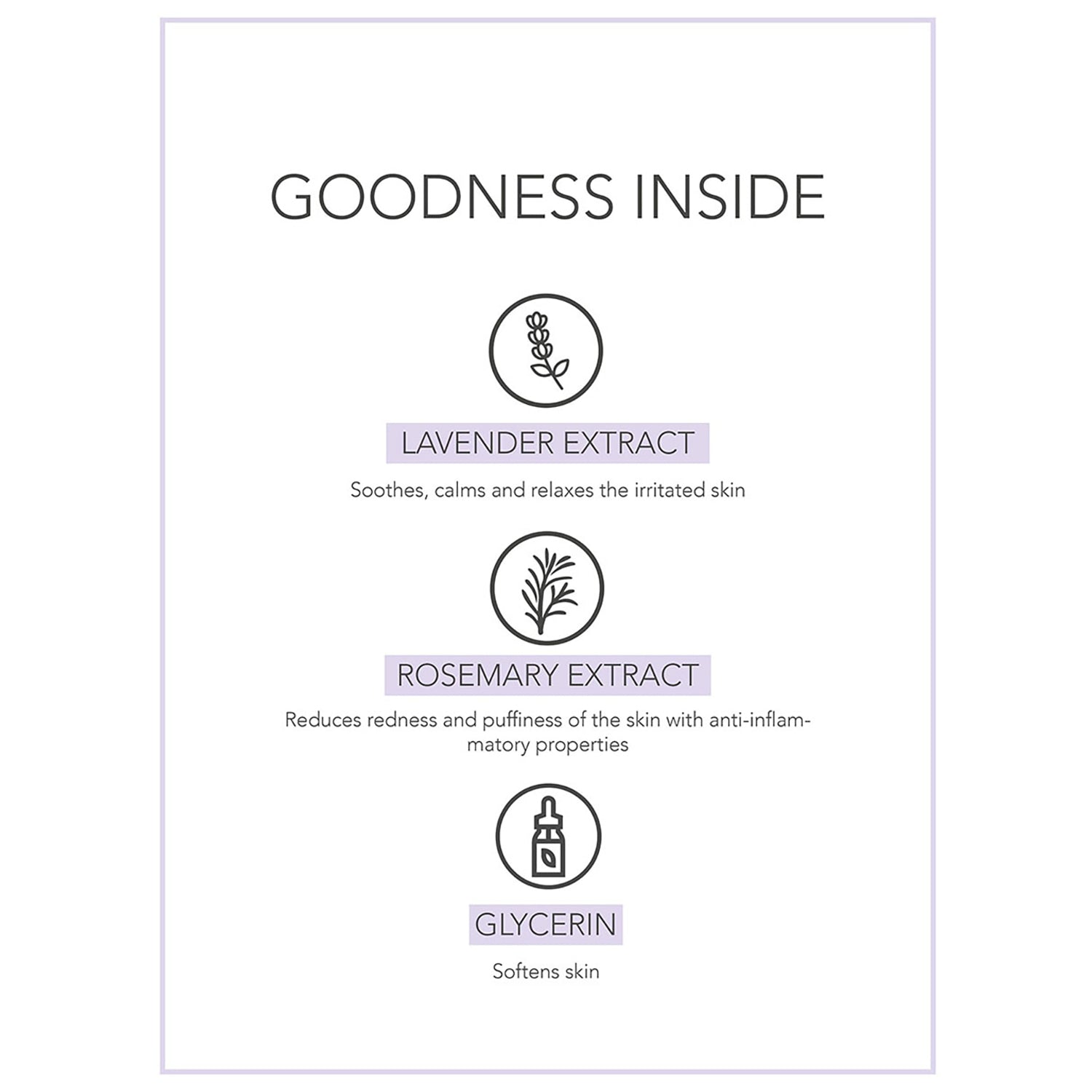 Glycerin, Salicylic Acid, Achillea Millefolium (Rosemary) Extract, Lavandula Angustifolia (Lavender) Extract
