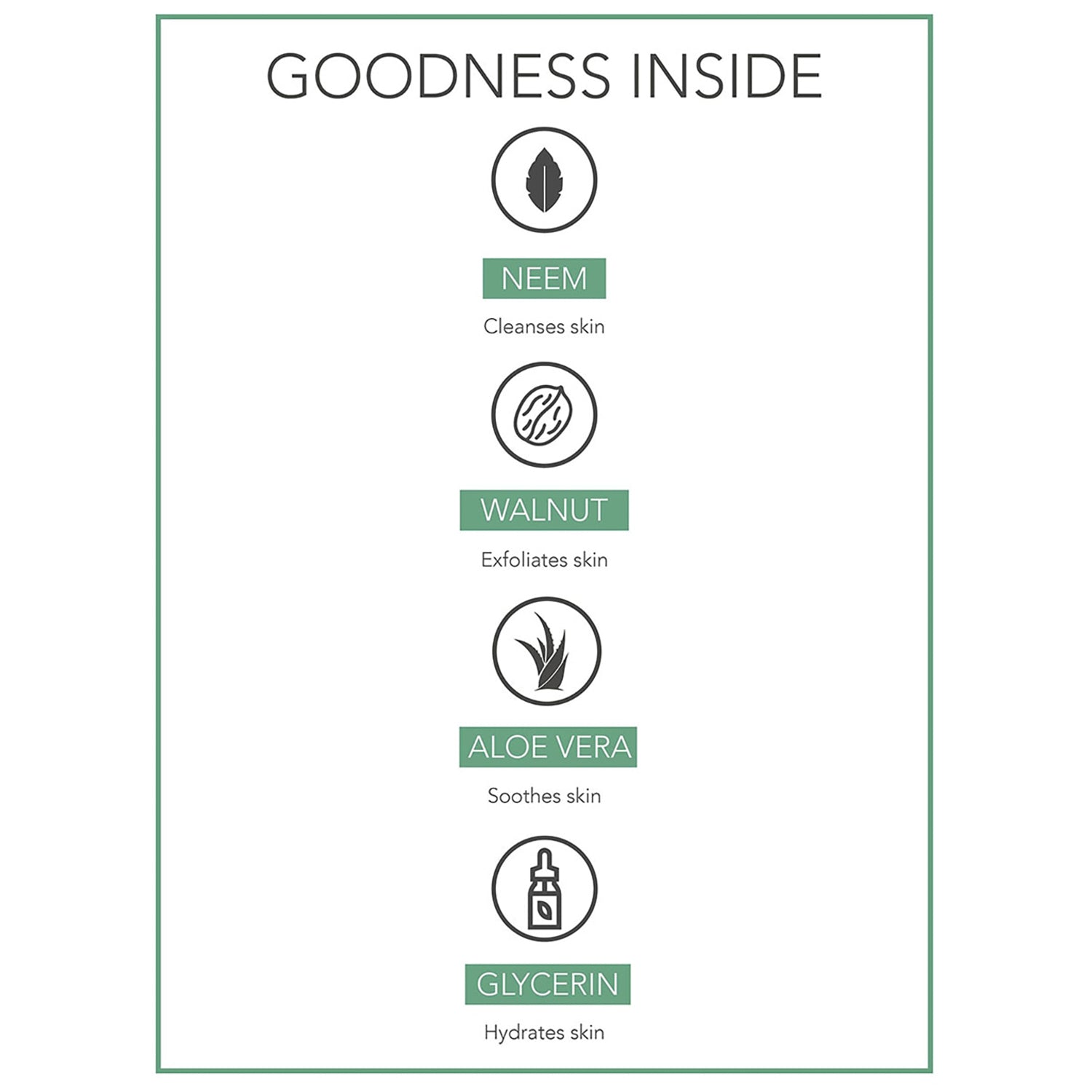 Aloe Barbadensis (Aloe Vera) Extract, Azadirachta Indica (Neem) Powder, Juglans Regia (Walnut) Granules.