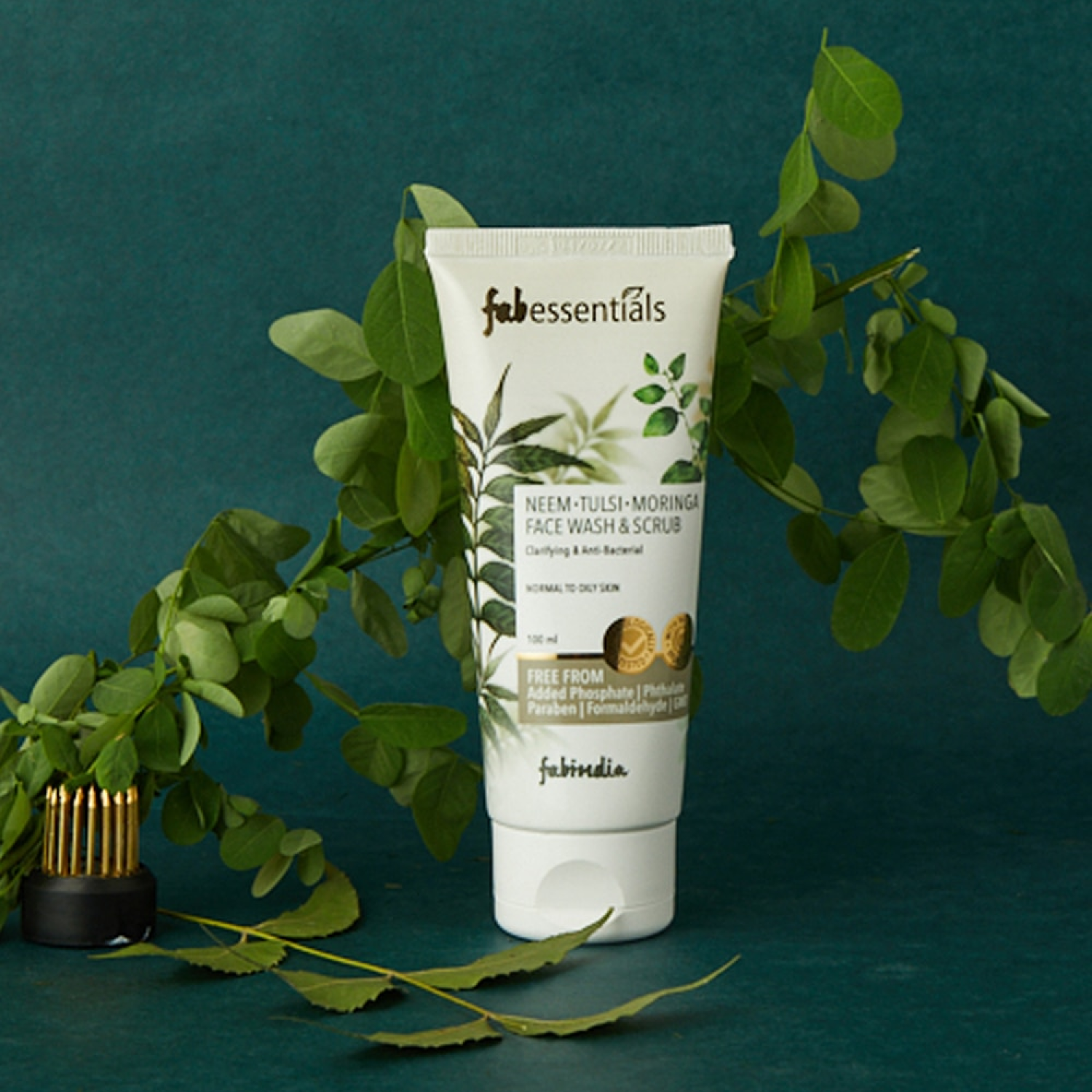 Fabessentials Neem Tulsi Moringa Face Wash & Scrub has the power of natural bio-actives. This purifying face wash is ideal for skin that is prone to oiliness and breakouts. Formulated for mild exfoliation & enriched with antioxidant packed Moringa extract, it helps to rebalance combination skin, prevent collagen damage & mattify shinier areas. Natural Walnut shell powder helps smooth debris build-up, leaving your face cleansed without feeling dry or tight.