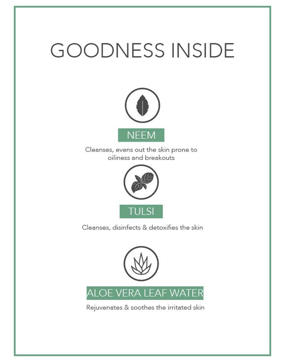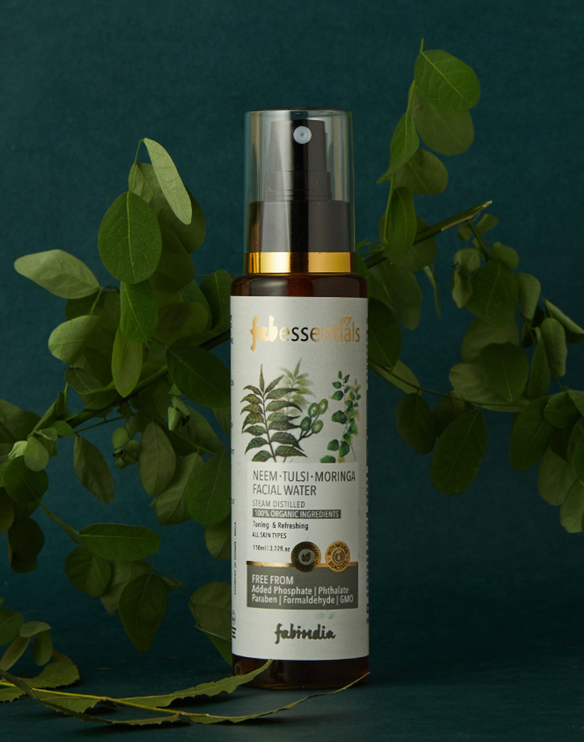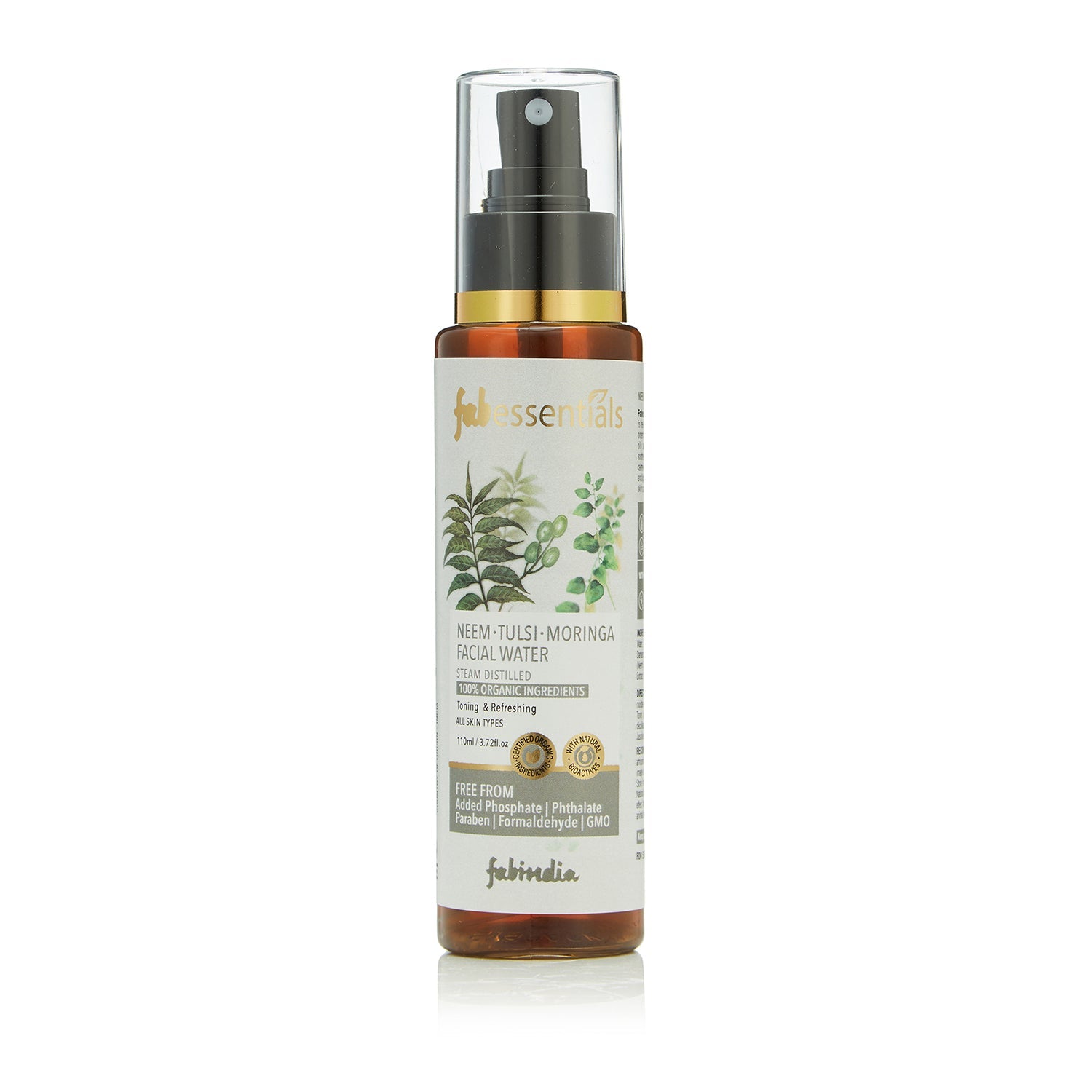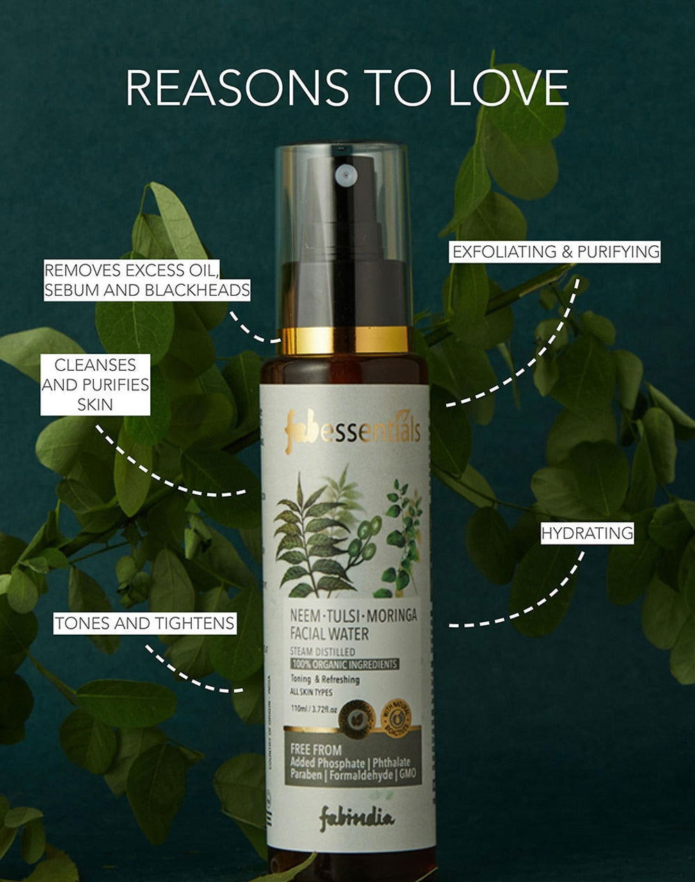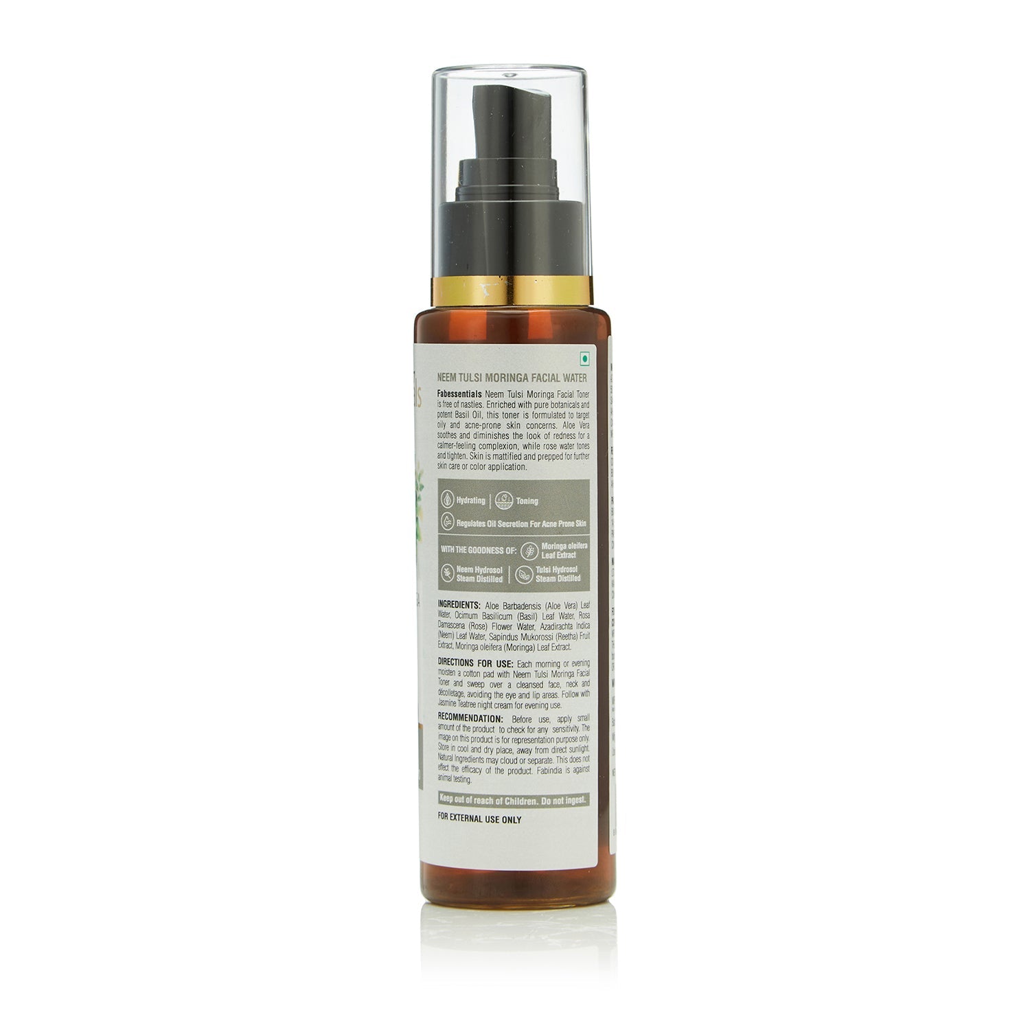 Fabessentials Neem Tulsi Moringa Facial Water is free of nasties. Enriched with pure botanicals and potent Basil Oil, this toner is formulated to target oily and acne-prone skin concerns. Aloe Vera soothes and diminishes redness for a calmer-feeling complexion, while rose water tones and tighten. Skin is mattified and prepped for further skin care or color application..