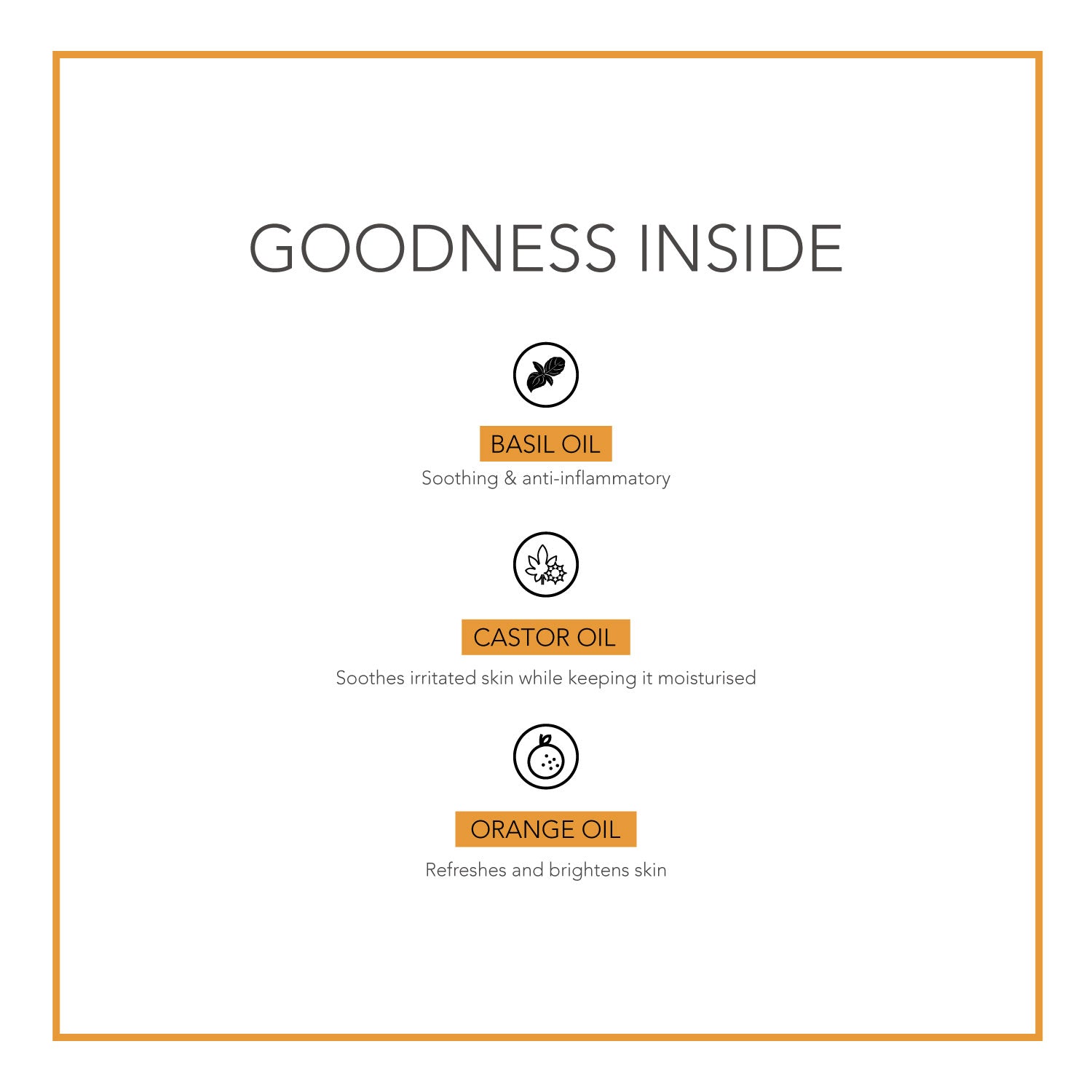 Cocos nucifera L. (Coconut ) Oil, Castor Oil, Perfume, (Vitamin E), Citrus sinensis (Orange) Extract, Ocimum Sanctum (Basil) Extract.