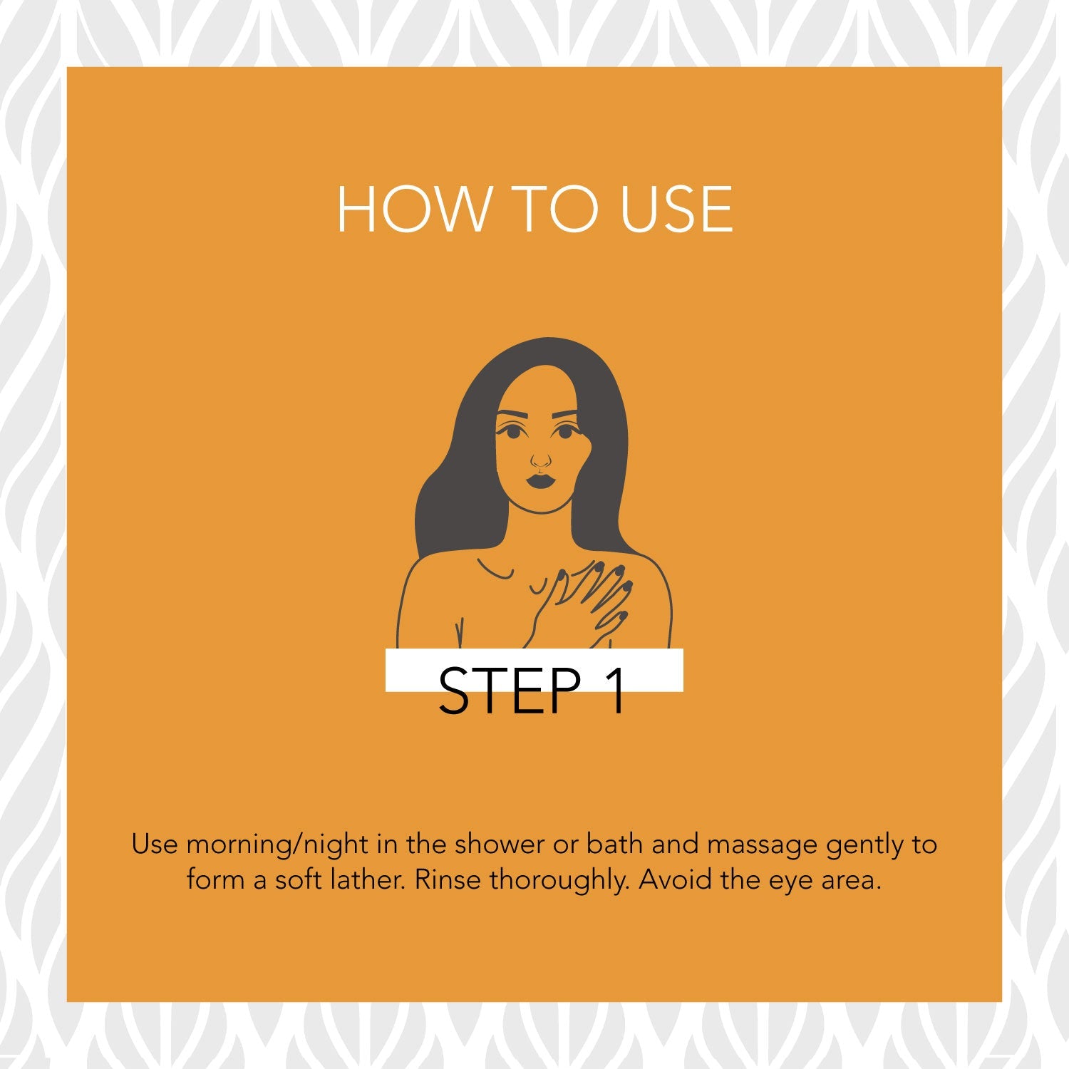 Use morning/night in the shower or bath and massage gently to form a soft lather. Rinse thoroughly. Avoid the eye area.