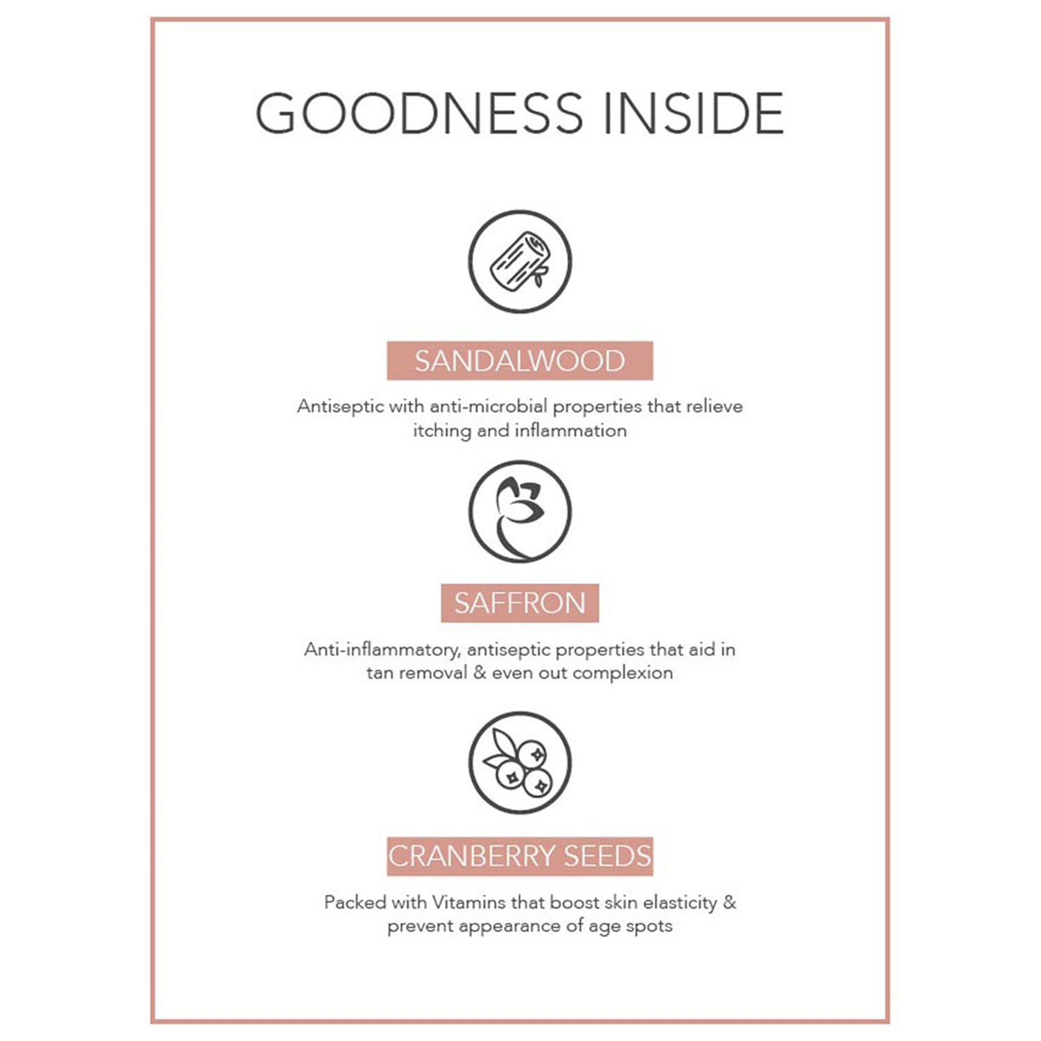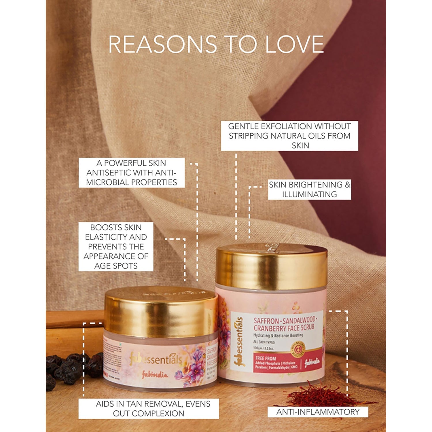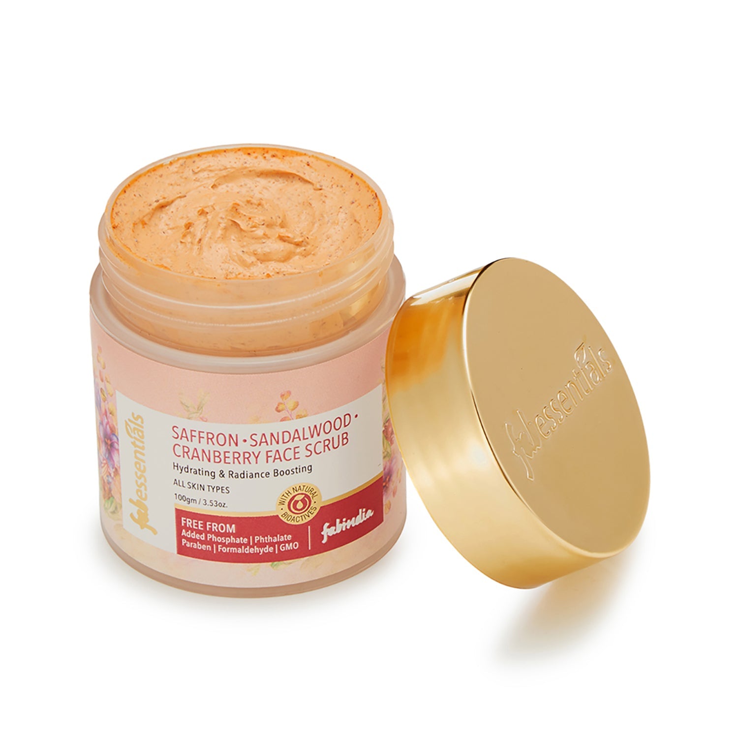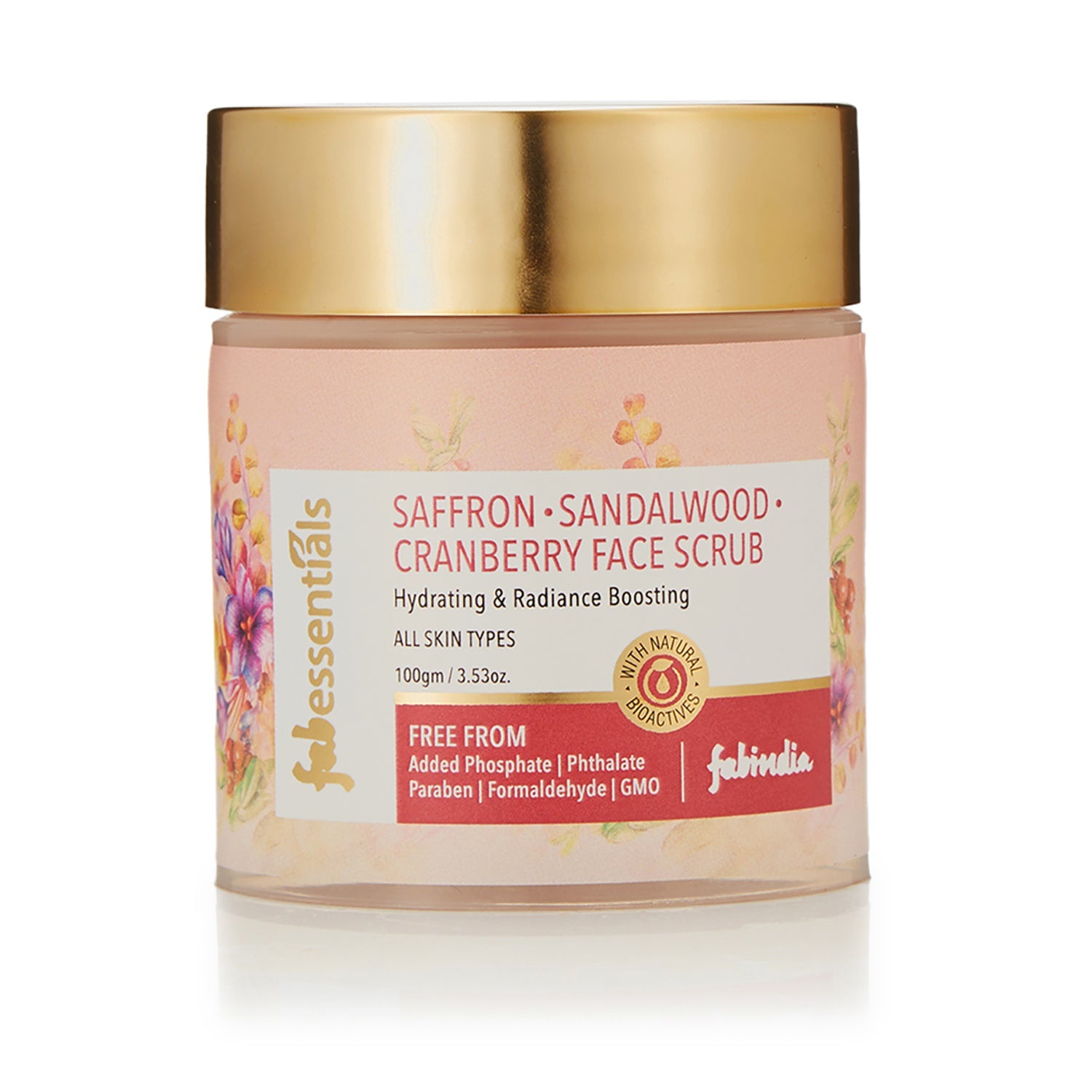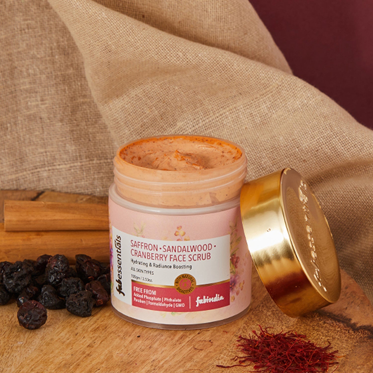 Fabessentials Saffron Sandalwood Cranberry Face Scrub free from nasties. Formulated with Cranberry Extract, an antioxidant packed super berry, known to be rich in resveratrol, this unique scrub contains micronized Cranberry seeds that can be used to gently exfoliate the skin while washing off after use.