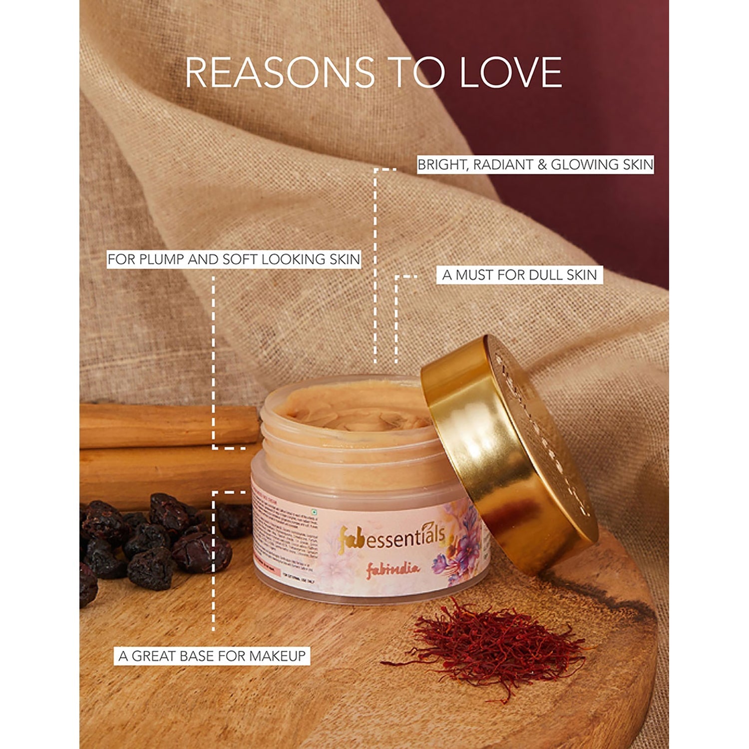 Description- Fabessentials Saffron Sandalwood Face Cream is enriched with Saffron Extract to ward off the effects of free radicals. A must for dull, lackluster skin, Sandalwood Oil helps to foster a brighter & more radiant finish. Daily use helps brighten skin’s appearance leaving your complexion gorgeously plumped and soft. It even improves makeup application, creating a luminous canvas for applying foundation and concealer.