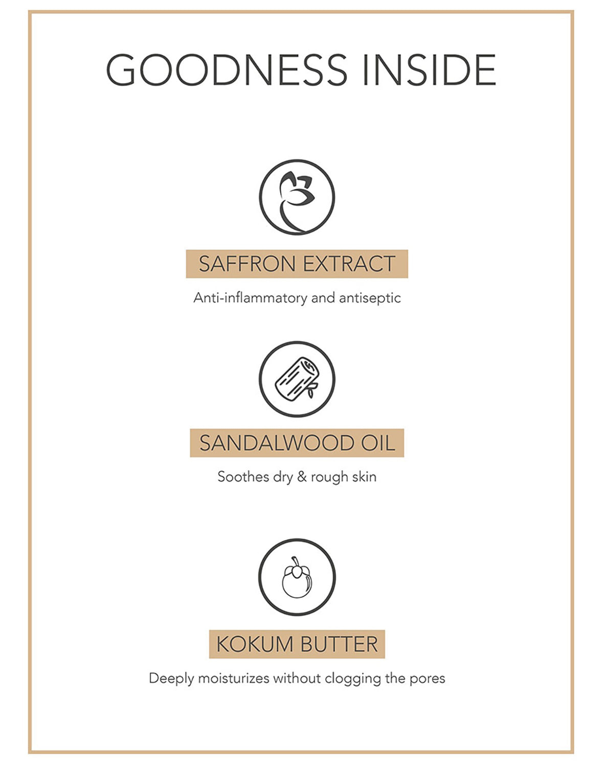 Glycerin, Garcinia indica (Kokum) butter, Astrocaryum murumuru seed butter, Crocus sativus (Saffron) extract, Allantoin, Santalum album (Sandalwood) oil