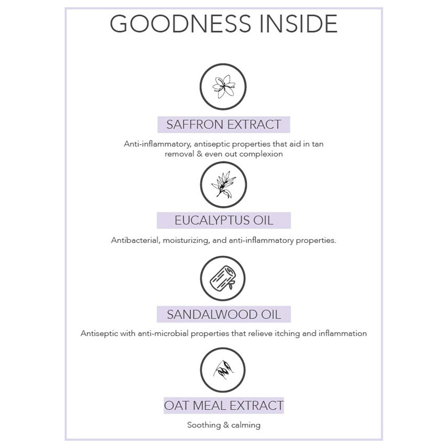 Glycerin, Avena Sativa Oat Meal Extract, Citrus Aurantium (Orange) Fruit Oil, Crocus Sativus (Saffron) Flower Extract, Eucalyptus Citriodora (Eucalyptus) Oil, Santalum Album (Sandalwood) Extract, Theobroma Cacao (Cocoa) Seed Butter