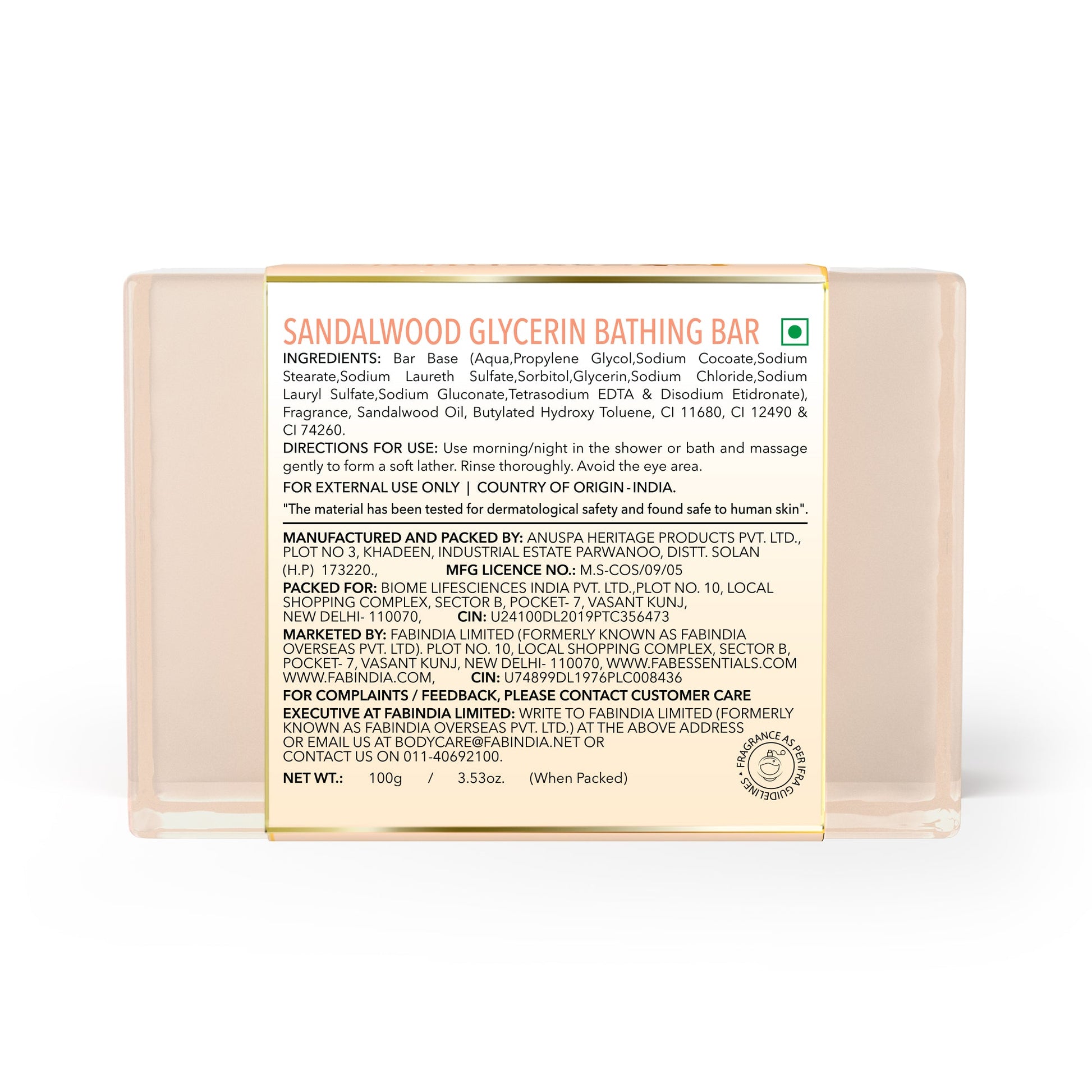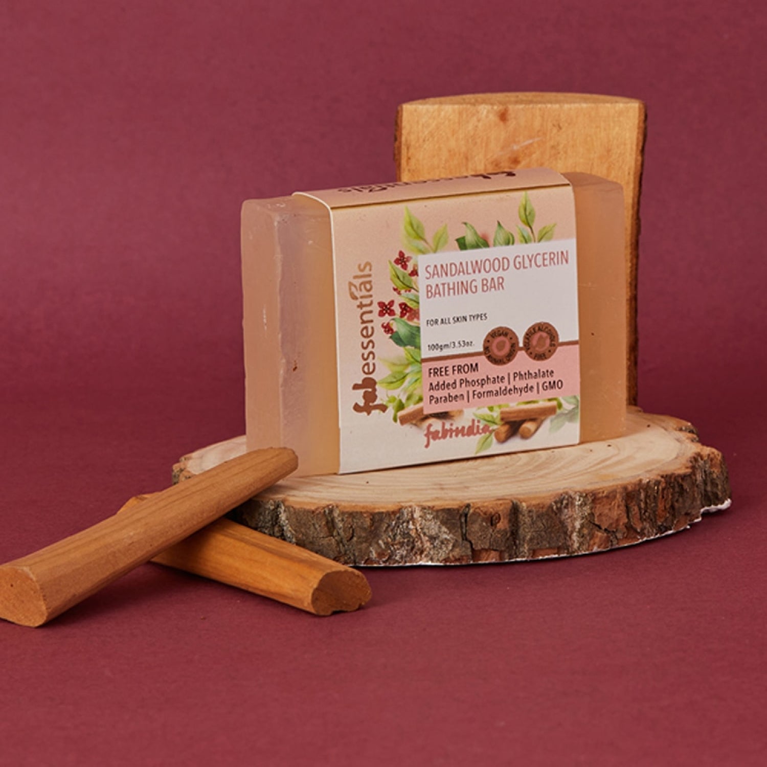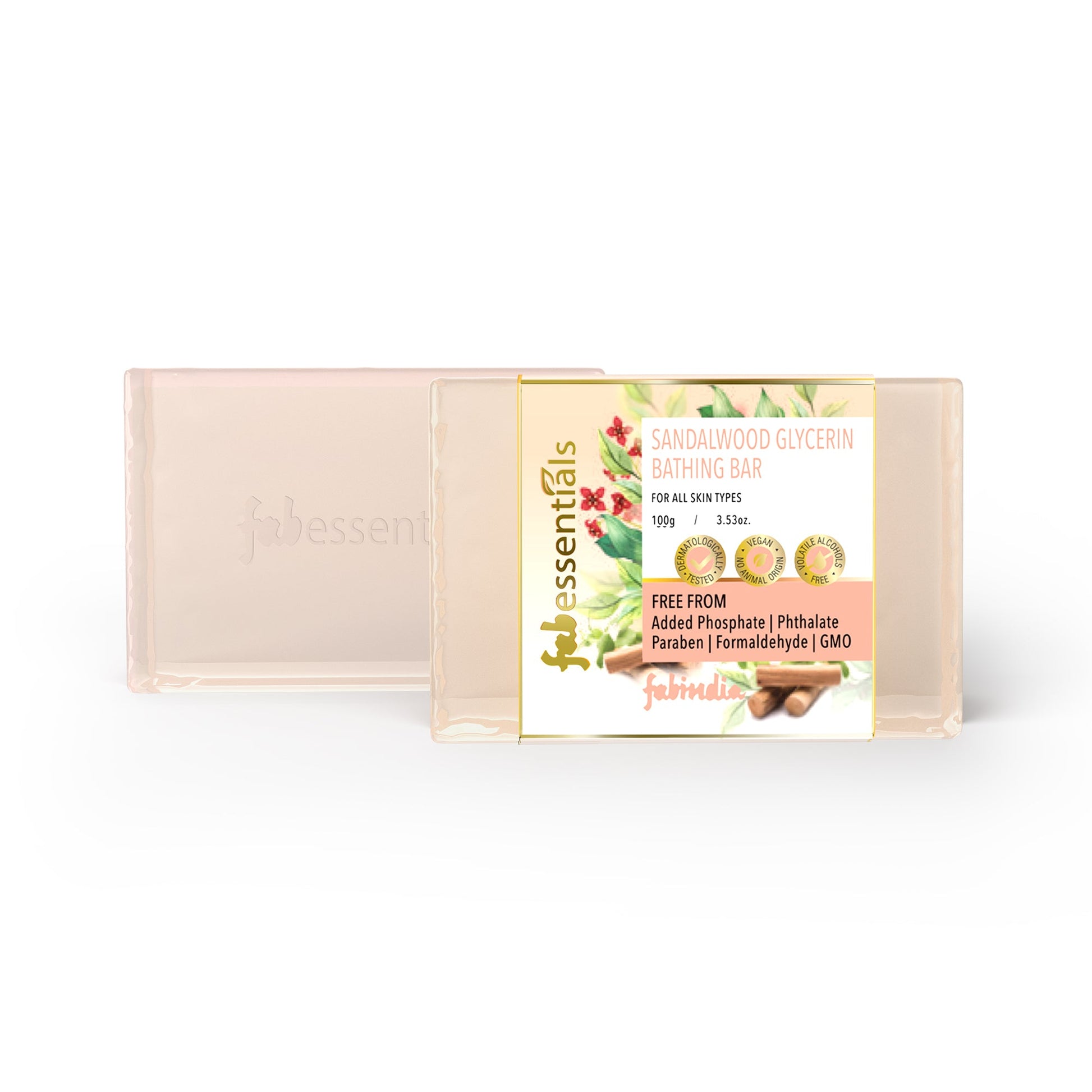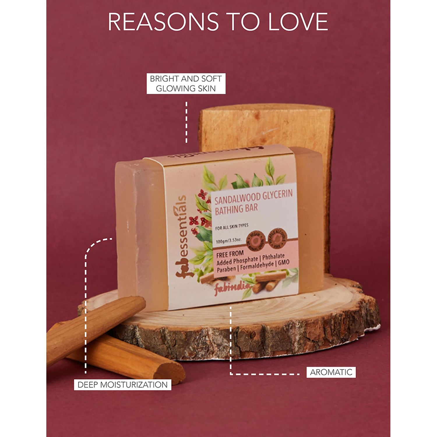 Fabessentials Sandalwood Glycerin Bathing Bar is enriched with Sandalwood and Glycerin. Free from toxins, this soap gently cleanses away dirt and grime from your body while retaining skin's natural moisture balance. Sandalwood is rich in antioxidants and reduces dryness and replenishes the moisture in skin, increasing elasticity, while Glycerin hydrates and moisturizes skin, and banishes dryness and roughness.