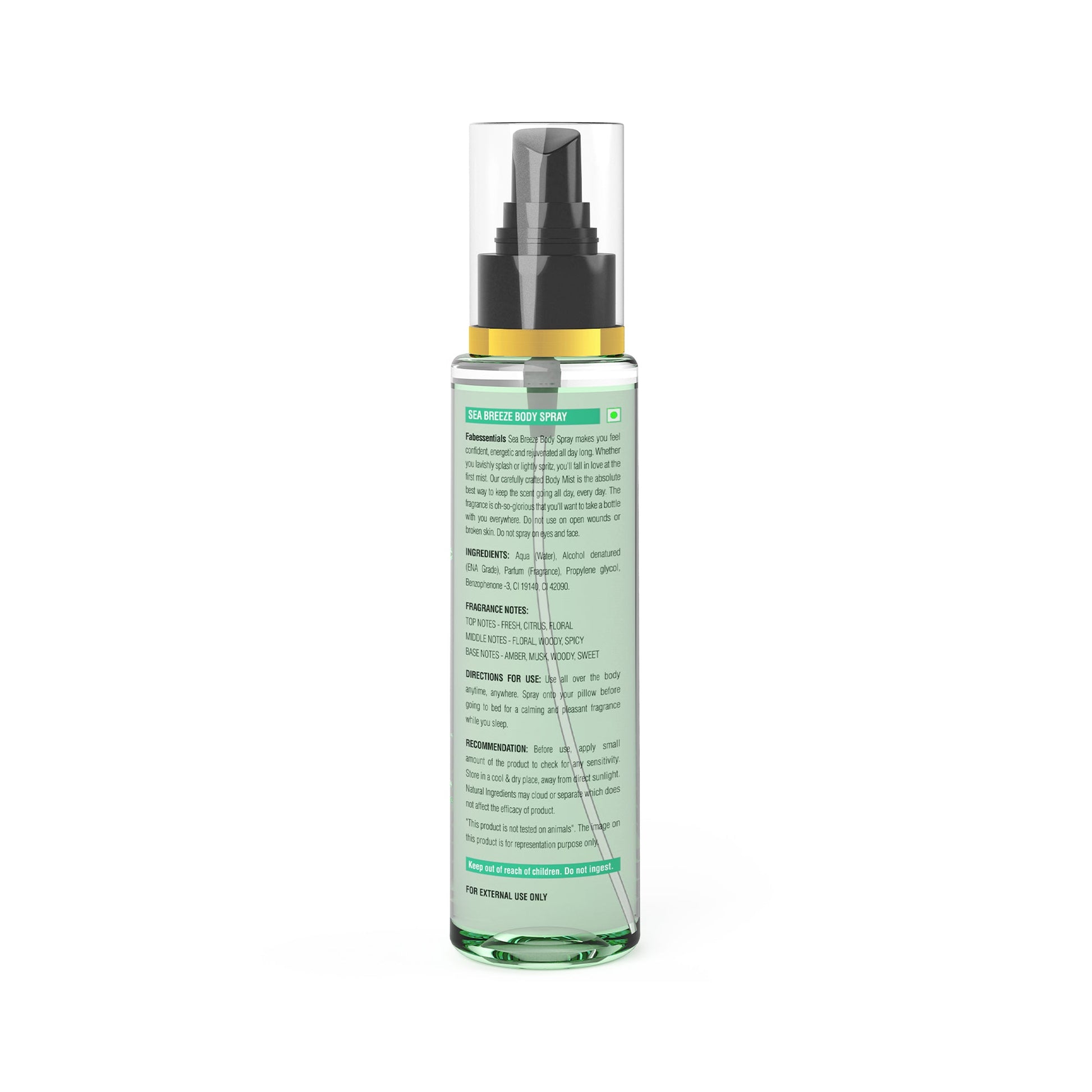 Fabessentials Sea Breeze Body Spray makes you feel confident, energetic and rejuvenated all day long. Whether you lavishly splash or lightly spritz, you'll fall in love at the first mist. Our carefully crafted Body Mist is the absolute best way to keep the scent going all day, every day. The fragrance is oh-so-glorious that you'll want to take a bottle with you everywhere. Do not use on open wounds or broken skin. Do not spray on eyes and face.