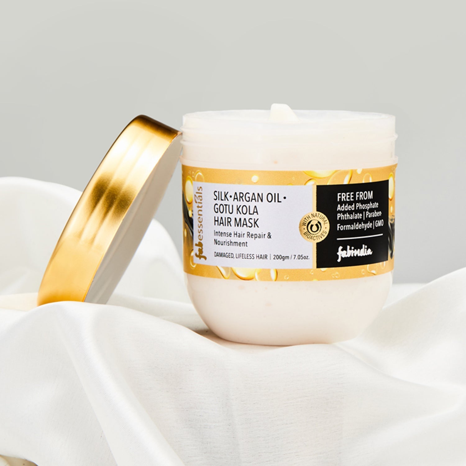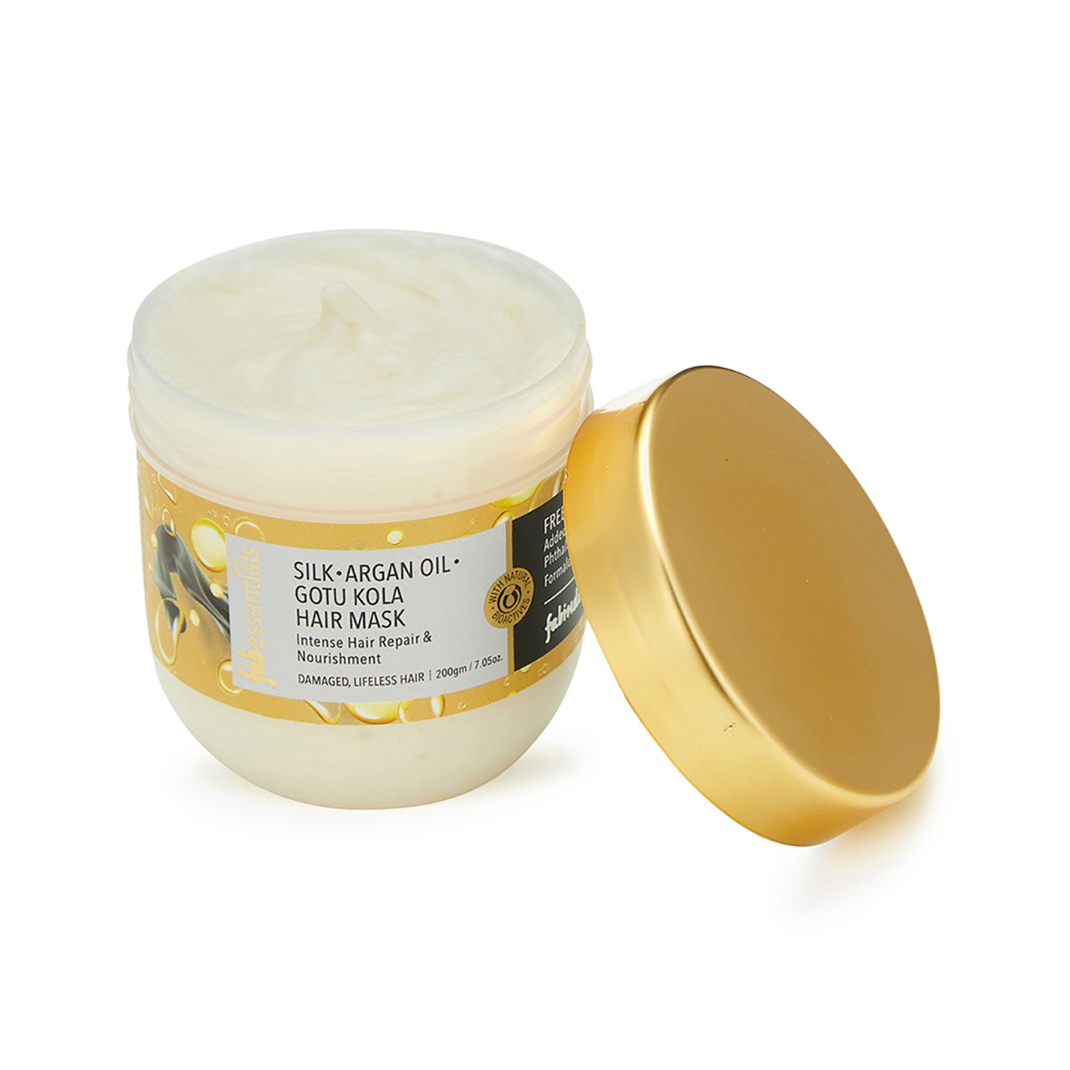 Fabessentials Silk Argan Oil Gotu Kola Hair Mask is enriched with Silk Proteins & a host of other nutritive ingredients that deeply hydrate & actively rehabilitate hair in need of extra care. It infuses shine, moisture and resiliency, leaving locks bouncy, vibrant and beautiful – Just like "a hug for your hair". Gotu Kola repairs & protects hair from a from environmental aggressors while Aloe Vera enhances moisture retention and shine. Also contains Argan Oil which provides rich, silky hair texture. The ultimate treat for stressed tresses, smells as good as it performs!