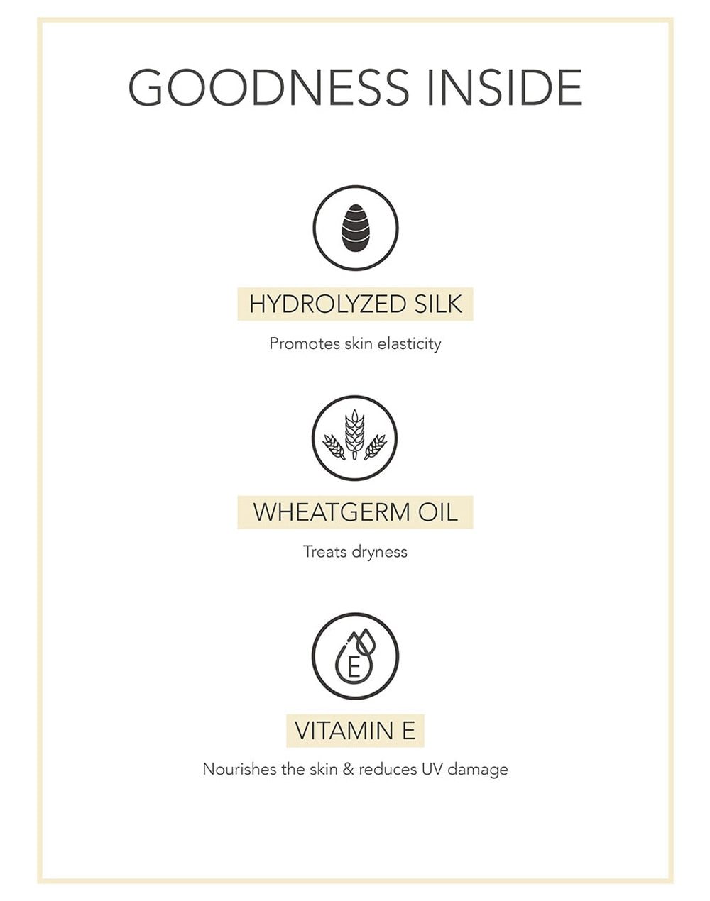 Helianthus annuus (Sunflower) seed oil, Butyrospermum parkii (Shea) butter, Hydrolyzed silk protein, Garcinia indica (Kokum) butter, Olea europaea (Olive) oil, Triticum vulgare (Wheatgerm) oil, Tocopheryl acetate (Vitamin E),