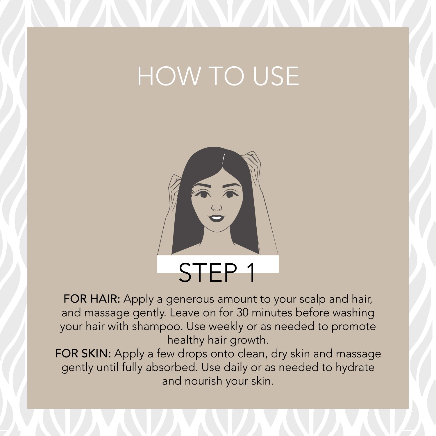 FOR HAIR: Apply a generous amount to your scalp and hair, and massage gently. Leave on for 30 minutes before washing your hair with shampoo. Use weekly or as needed to promote healthy hair growth.