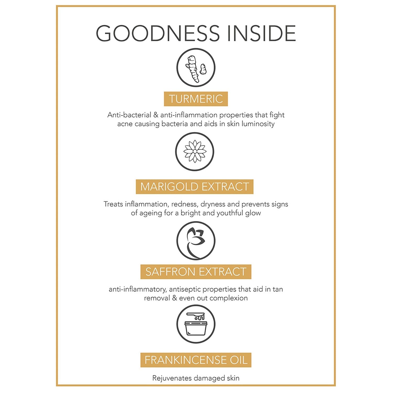 - Marigold & Saffron Extract gently heals & soothes the skin, working as a powerful antiseptic