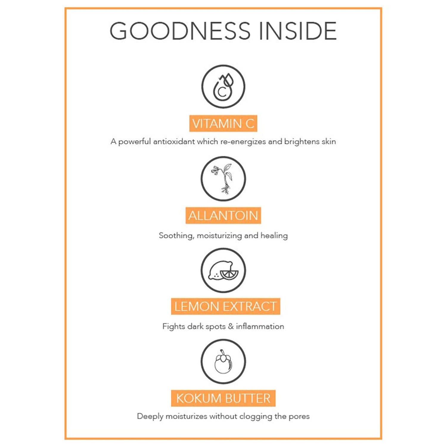 Glycerin, Aloe barbadensis (Aloevera) juice, Garcinia indica (Kokum) seed butter, Glycerol monostearate, Allantoin, Tocopheryl acetate (Vitamin E), Emblica officinalis (Amla) extract, Citrus limon (Lemon) extract, Citrus sinensis (Orange) oil, 3-O-Ethyl Ascorbic acid (Vitamin C)
