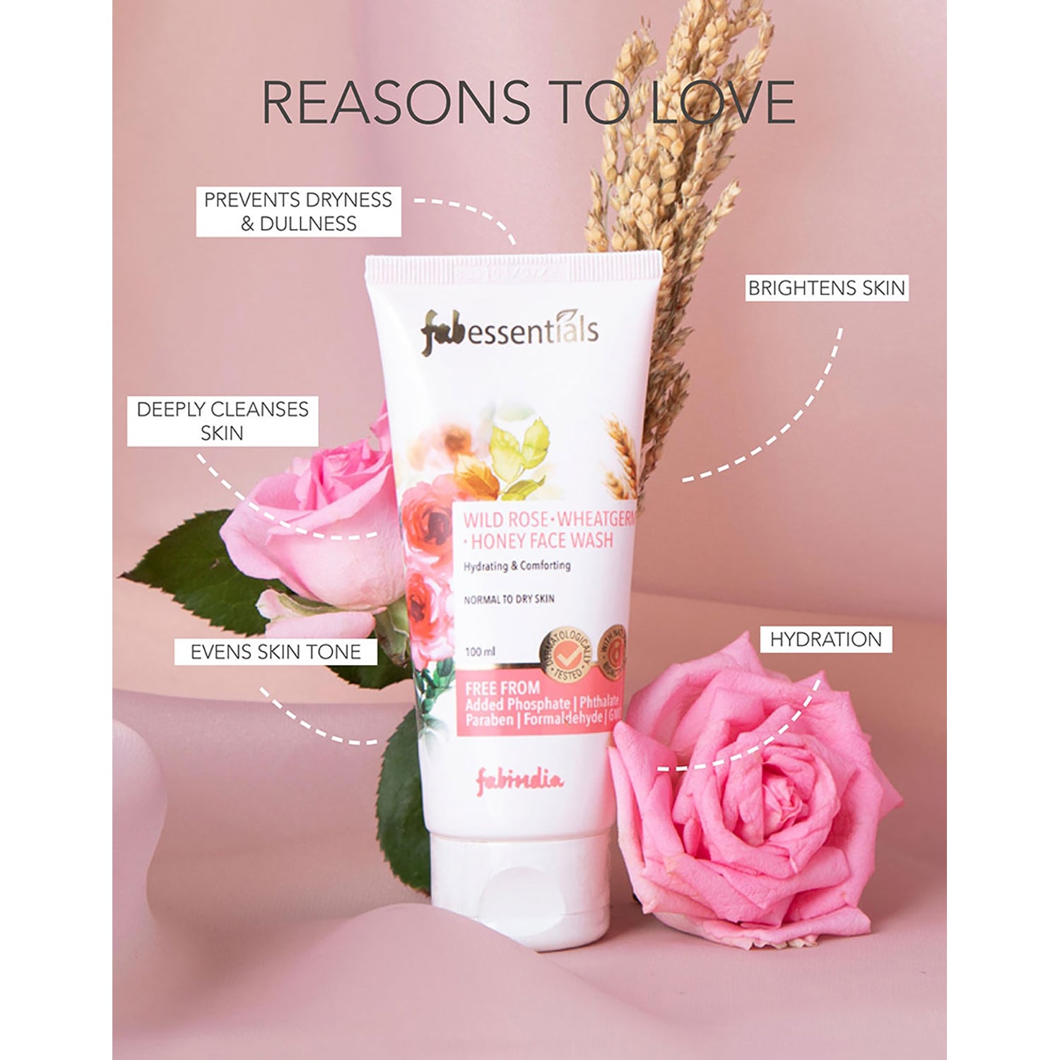 Fabessentials Wild Rose Wheatgerm Honey Face Wash is made with natural bio-actives that leave the skin bright and hydrated. It is made with the goodness of Wild rose & Wheatgerm which is rich in Vitamin E & Minerals. Packed with antioxidants, it is antibacterial & anti-inflammatory in nature with the goodness of Honey to promote skin health while cleansing with utmost care.